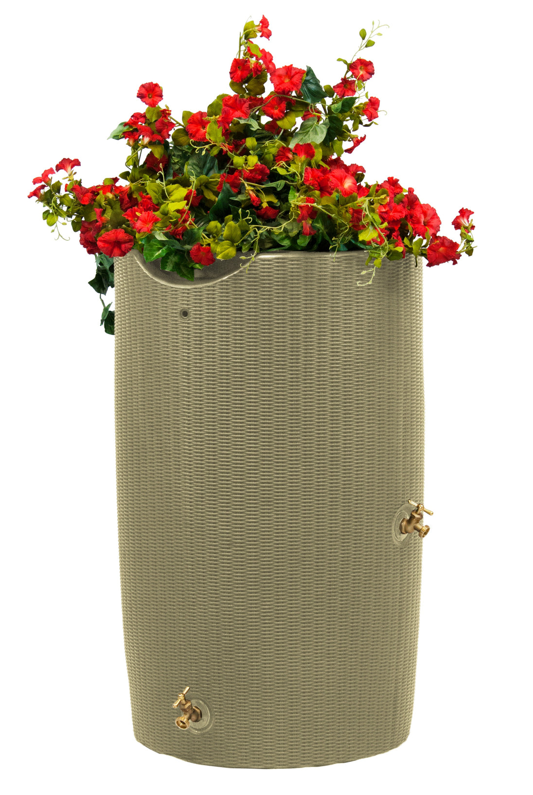 The Impressions Bali 50 Gallon Rain Saver is perfect for virtually any home. Its appearance emulates the rotund woven texture of a wicker storage bin, and with a deep welled top, you can plant an array of flowers or even a small herb or vegetable garden. The top also includes the Good Ideas original, integrated channel that automatically diverts overflow to the front of the barrel and keeps your foundation from flooding. The large opening which can be used for 2x3 or 3x4 downspouts is covered with a soft, fine mesh, plastic screen that keeps out heavy debris. Also included with the barrel are two sturdy metal spigots to install in the offset spigot locations.