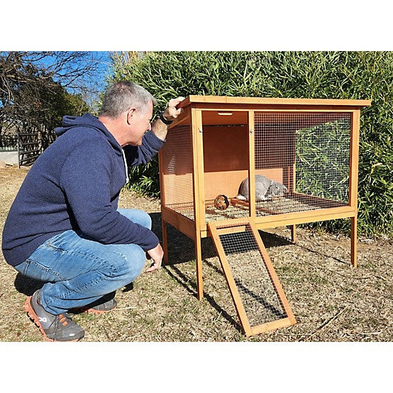 The Zylina Rabbit Hutch for Rabbits, Bunnies and Guinea Pigs is an excellent habitat for your pet! The waterproof asphalt shingle roof of this hutch provides protection for rabbits and guinea pigs from the elements. The hutch area is easily accessible for cleaning, featuring a hinged roof and bottom slide-out tray. The front door drops down as a functional built-in entry ramp feature to allow your pet to enter the hutch. The mesh door with a small gauge wire of this ensures proper air circulation while keeping your pets secure with a lockable door. The elevated design of the hutch keeps your pets off the ground and away from cold, moisture, and predators. Zylina...Connecting Lifestyle With Nature. A portion of Zylina proceeds support Plant With Purpose to address global poverty and environmental damage.
