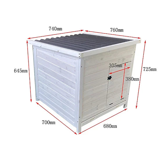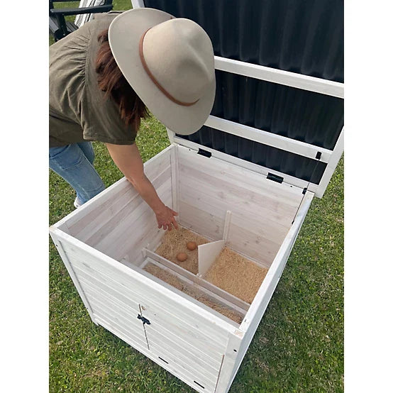 Features Two Nesting Bays Top and Side Access Easy Access Pull Out Tray White with Black Hardware Easy to Assemble Perfectly Sized for Hens to lay eggs