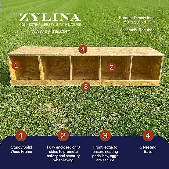The Zylina Best Rest 5 Bay Nesting Box is perfectly sized for your hens to optimize egg laying! This easy to assemble Nesting Box is made of natural. 5 Bays of Nesting Box provides a perfect solution for a large flock! Zylina...Connecting Lifestyle With Nature. A portion of Zylina proceeds support Plant With Purpose to address global poverty and environmental damage. Zylina Poultry products include Coops, Nesting Boxes, Mealworms, Perches & Pens.