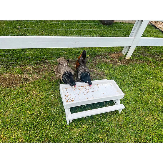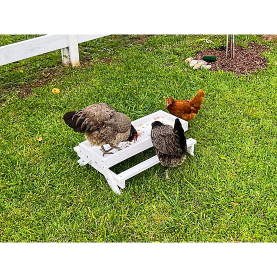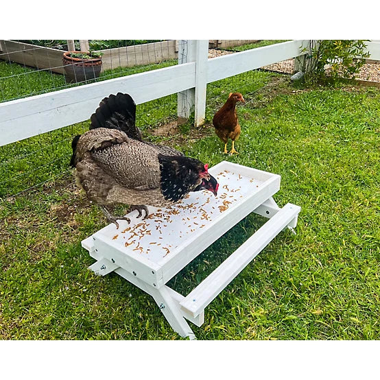 The Zylina Snack-N-Feed Picnic Table is the perfect place for your flock to feast! This easy to assemble Chick-nic table is great for treats like Zylina "Healthy Mealworms"! In addition, the table is an excellent table-top for fruits, veggies and chicken feed/scratch. The Snack-N-Feed Picnic Table is modern white to go with almost coop style and is equipped with perches on both sides. Zylina...Connecting Lifestyle With Nature. A portion of Zylina proceeds support Plant With Purpose to address global poverty and environmental damage. Zylina Poultry products include Coops, Nesting Boxes, Mealworms, Perches & Pens.