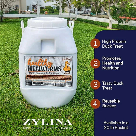 Watch your flock waddle with joy over Zylina Healthy Mealworms for Ducks! Zylina Healthy Mealworms are a tasty and nutritious treat your flock will love! Rich in protein and great for molting support, Zylina Healthy Mealworms are a ducks favorite! Zylina Healthy Mealworms are available in 5 pound bags or 20 pound buckets. Zylina...Connecting Lifestyle With Nature. A portion of Zylina proceeds support Plant With Purpose to address global poverty and environmental damage. Zylina Poultry products include Coops, Duck Houses, Nesting Boxes, Mealworms, Perches & Pens. 100% Natural Rich in Protein Molting support Great for busting boredom!