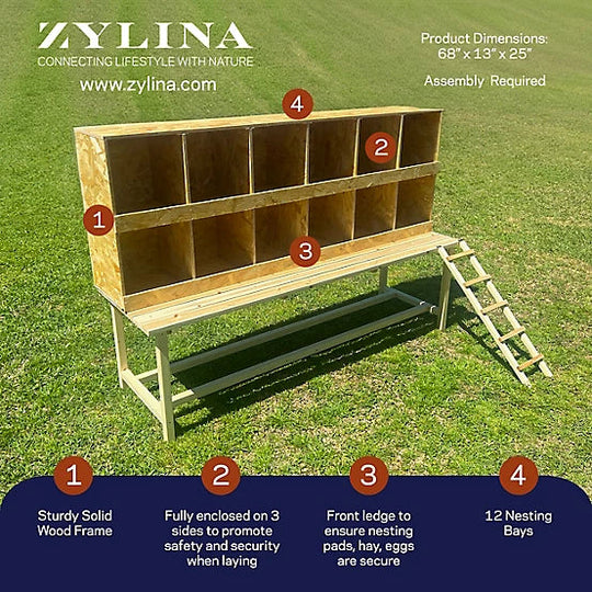 Description The Zylina Best Rest 12 Bay Nesting Box is perfectly sized for your hens to optimize egg laying! This easy to assemble Nesting Box is made of natural wood. The 12 Bay Nesting Box fits...Sale price $308.00Regular price $349.00Sale price $308.00Regular price $349.00 -