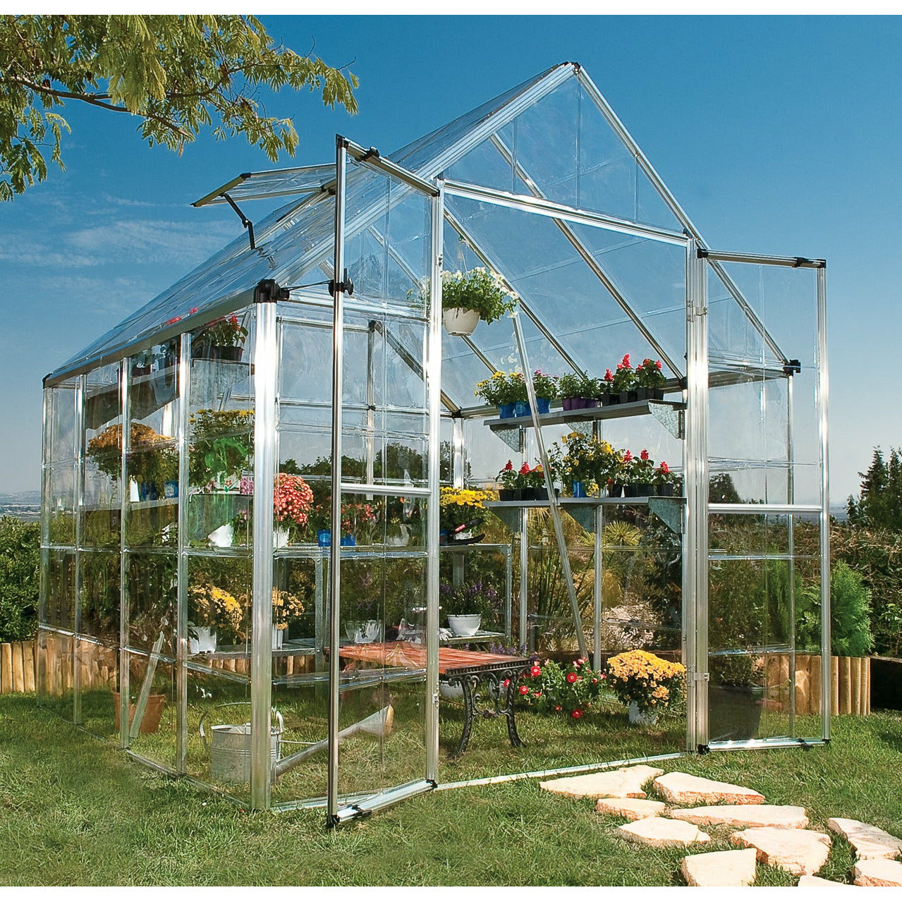 The Snap & Grow 8' x 8' Silver Frame Hobby Greenhouse features the SmartLock connector system. Heavy duty aluminum frames assemble easily without a lot of hardware. Crystal-clear SnapGlas panels slide right into the frame, lock into place and are virtually unbreakable. The 8’ wide greenhouse offers double hinged doors that allow easy access for your larger items and plants. Aluminum framework, clear single layer polycarbonate panels, swinging front doors, rain gutters and roof vent are standard features of the Snap & Grow. This greenhouse makes any backyard a sanctuary.